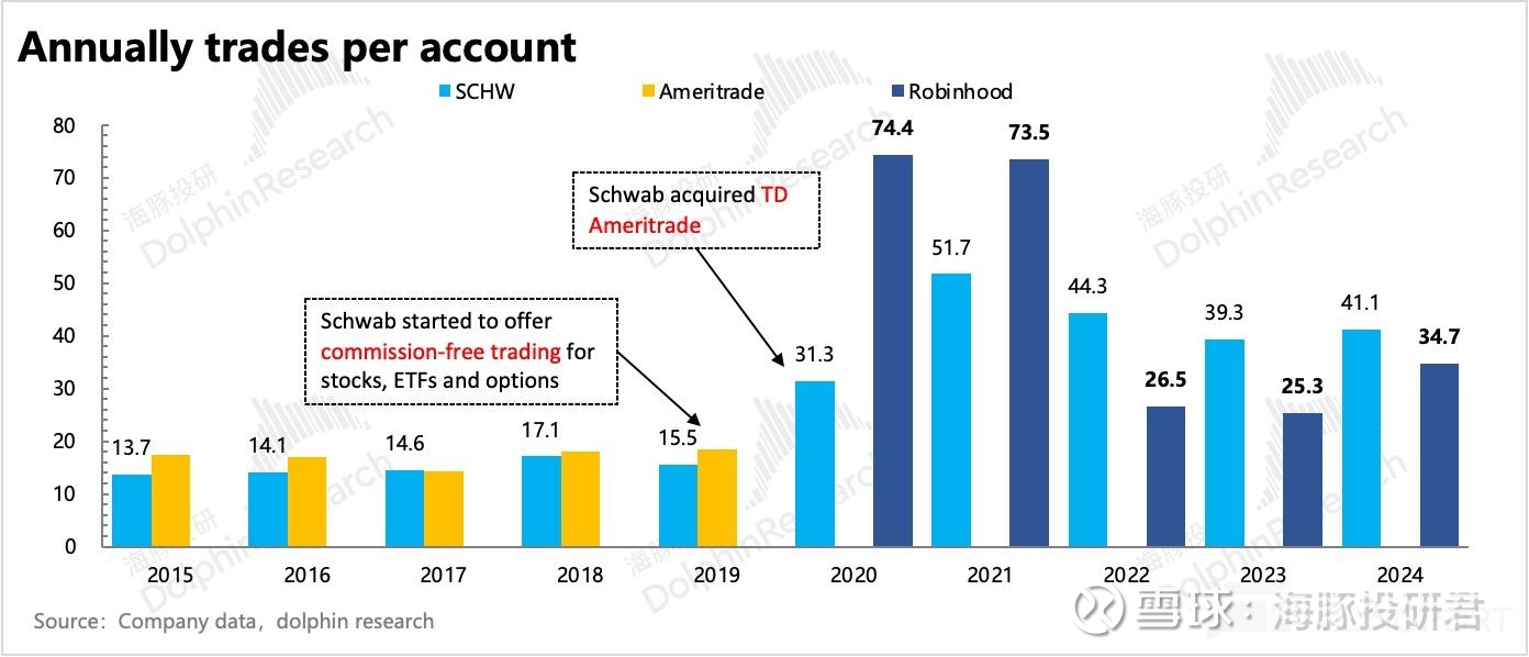 对比同行,在用户渗透率上嘉信虽然还不是全美第一,但综合来看,妥妥行业TOP。以2024年末的数据为例: