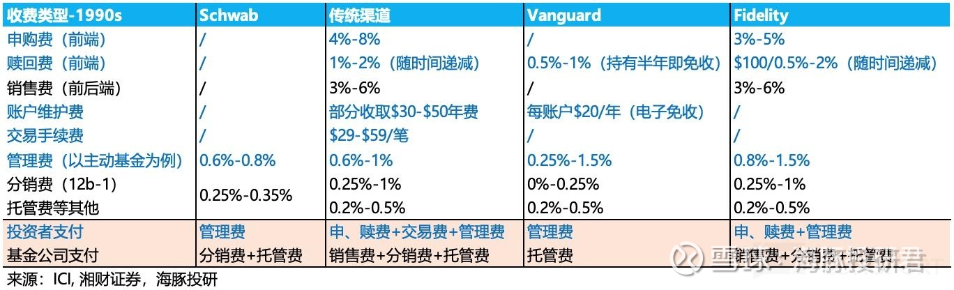 如下图,综合传统渠道、Vanguard以及同样是头部规模的Fidelity比较来看,Schwab不仅对用户端收费友好(管理费从基金净值中扣除,明面上可以宣传“免费”),同时对基金公司而言,渠道运营成本同样更有性价比优势。
