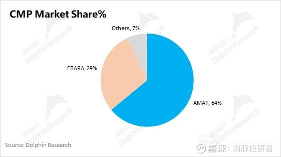 在 CMP 设备领域,应用材料 AMAT 也是拥有绝对领先的地位,占据了 60% 以上的市场份额。竞争对手主要是日本荏原 EBARA,两家公司合计占据了 9 成以上的市场份额。