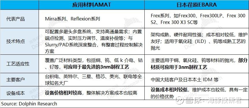 将两家公司的 CMP 产品进行对比,可以看出应用材料 AMAT 的 CMP 设备更为领先。公司能提供 Mirra(专注于 150-200mm)、Reflexion(专注于 300mm)两大技术平台,基本可以满足各类型材料的需求,并能应用于最先进的 3nm 制程工艺,而日本 EBARA 的 CMP 产品只能适用于部分材质。