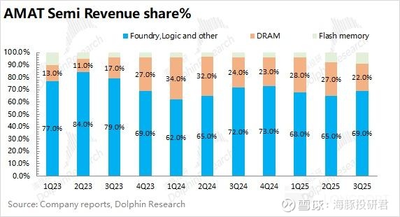 c)逻辑与存储双轮驱动:面对半导体周期性波动,应用材料以逻辑市场(占 7 成收入)为基本盘,对冲存储市场(占 2-3 成)的强周期风险。2025 年逻辑端借台积电 AI 芯片需求稳增长,存储端受 HBM 相关开支反弹的带动,双市场互补布局,使其在行业波动中保持相对稳健。