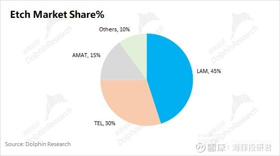 应用材料 AMAT 目前在刻蚀领域是追随者的角色,大致占据 15% 的市场份额。在刻蚀市场中,LAM 和东京电子都是市场的领先者。
