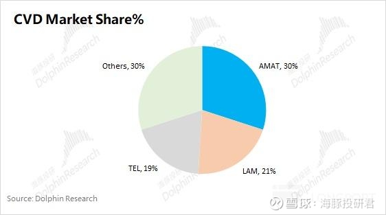 ②化学气相沉积 CVD 设备:类似 “用气体在硅片表面 ‘吹’ 出薄膜”,适合镀绝缘层。应用材料 AMAT 处于第一梯队,相对领先。全球的 CVD 设备市场空间约 130 亿美元,应用材料的市场份额约为 30%,与 LAM(21%)、TEL(19%)同处于第一梯队,仍有一定的优势。