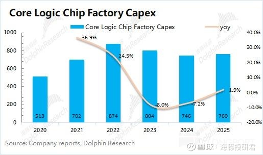 整体来看,海豚君预期七大核心逻辑芯片厂商的资本开支合计为 760 亿美元左右,同比增长 1.9%。