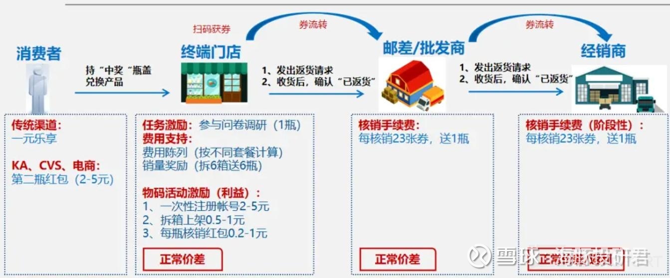 第一阶段:“一元乐享 “实现 BC 端联动:2015 年前后,彼时软饮行业主流的营销手段还停留在康师傅开创的“再来一瓶 “促销模式,但这种模式兑奖流程复杂,需要经过消费者、终端门店、经销商等多级流转,效率低下,导致很多终端门店配合意愿并不高。