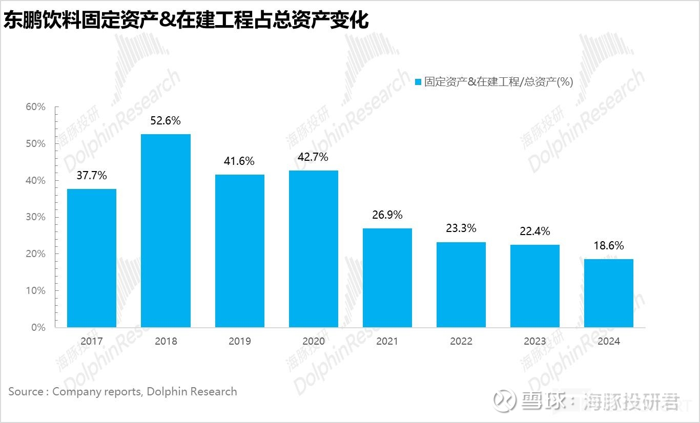 从下图可以看到,东鹏上市前固定资产 + 在建工程占总资产比例高达 30% 以上,上市后伴随公司近年来加速全国化,产能爬坡带动规模效应释放,截至 25H1,这一比例下降至 23%。