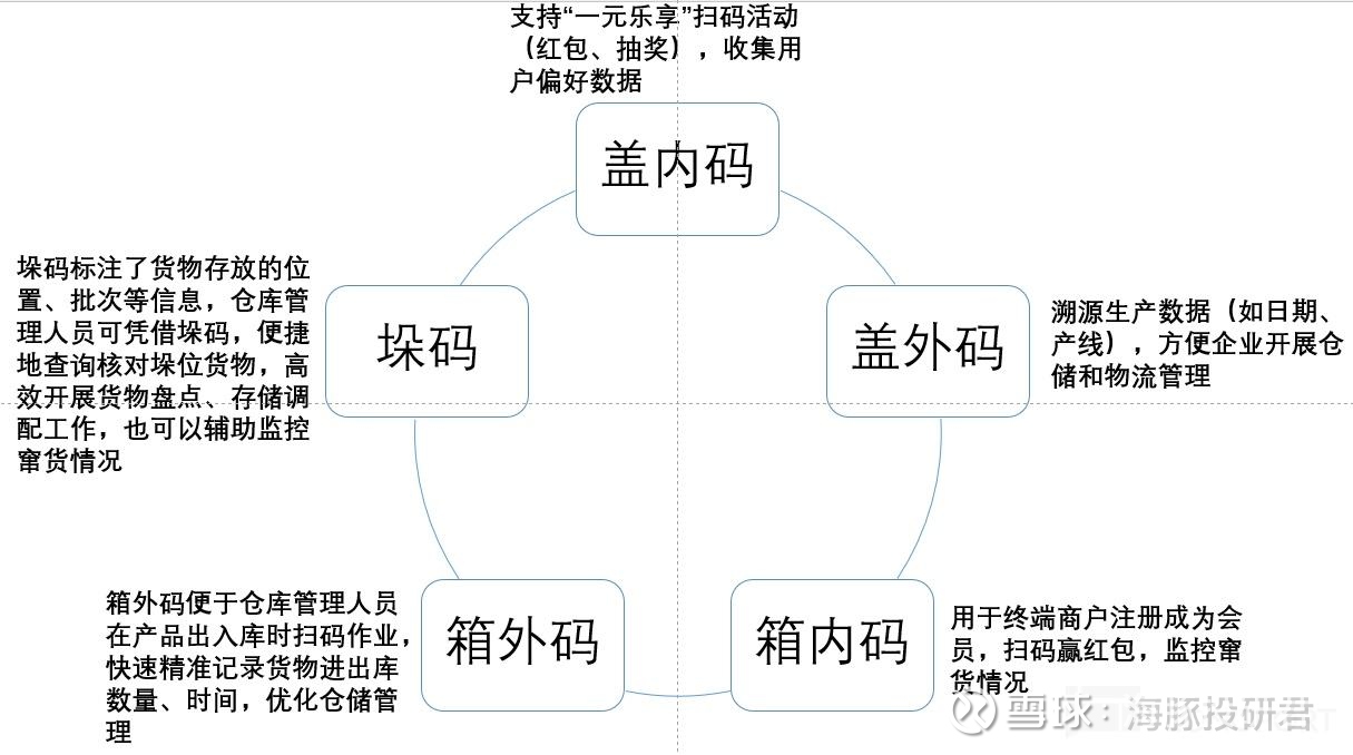 因此,在这个基础上,2019 年东鹏对产线进行改造,每瓶出厂的东鹏饮料在生产线上都会被赋予盖内码和盖外码,当 24 瓶饮料包装成一箱时,盖内码和盖外码会与箱内码和箱外码关联,同时与垛码以及每批货物的批次号绑定,实现了瓶箱关联、五码合一,使得东鹏可以对产品全生命周期进行监控(生产、出库、入库、销售、核销等)。