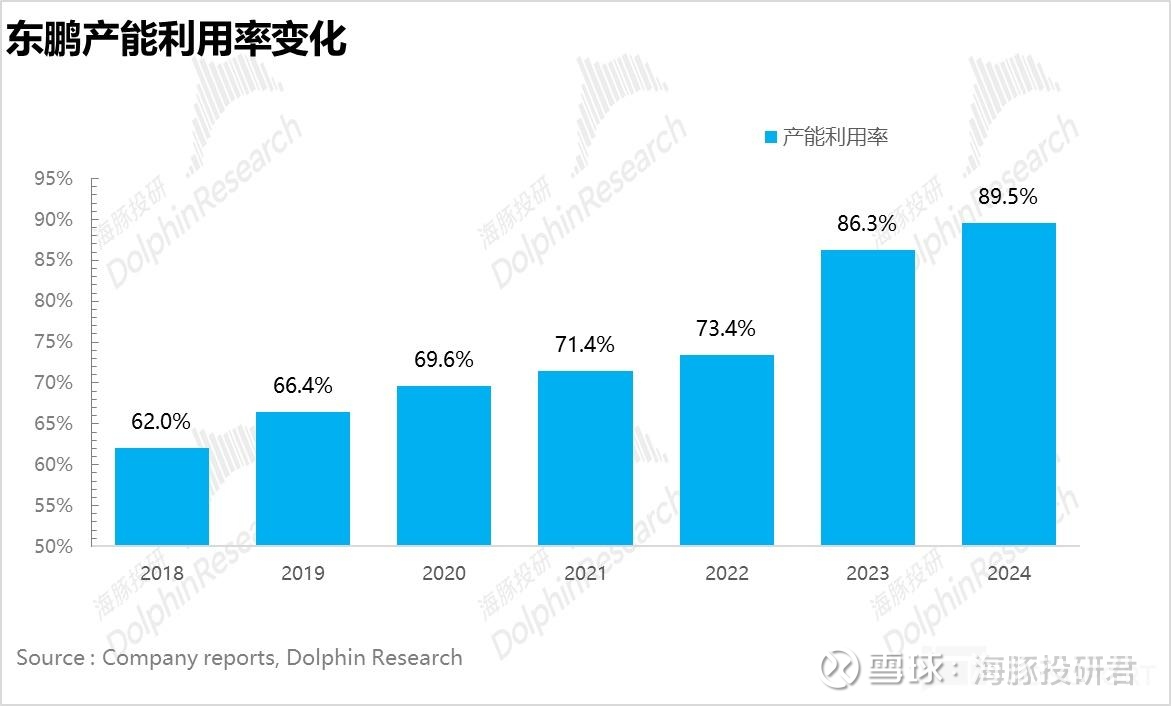 而从下图可以看到东鹏的产能利用率从 2018 年开始逐步爬坡,截至 2024 年底已经达到 90%,放眼整个软饮料行业,基本属于顶尖水平(软饮料行业的平均产能利用率在 70%-80% 之间),反映的是东鹏超高的单线生产效率。