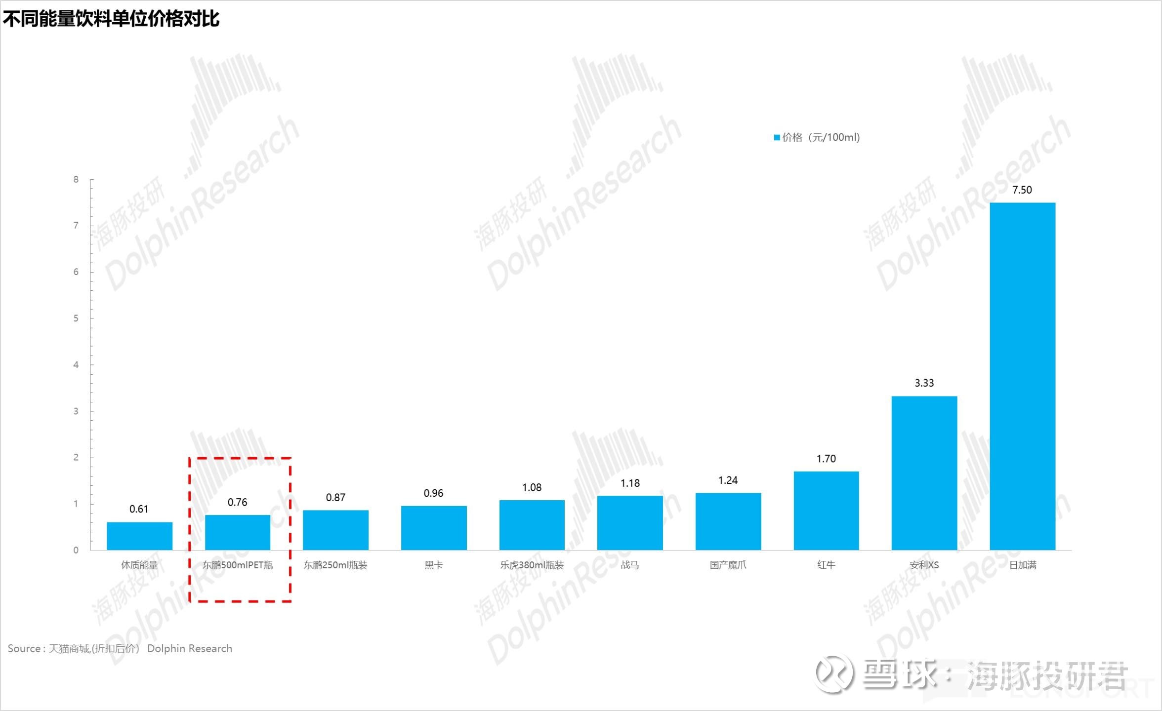 蓝领人群最大的特征就是价格极度敏感,因此东鹏在产品上力求量大实惠,和红牛相比,在功效相近的情况下,容量加倍后价格仍然便宜 1 元。从下图可以看到,如果按照单位毫升价格来算,东鹏特饮基本是国内能量饮料里最便宜的。而高性价比不仅让东鹏扩大了自身的受众群体,也实现了从低频可选向高频必选属性的转变。