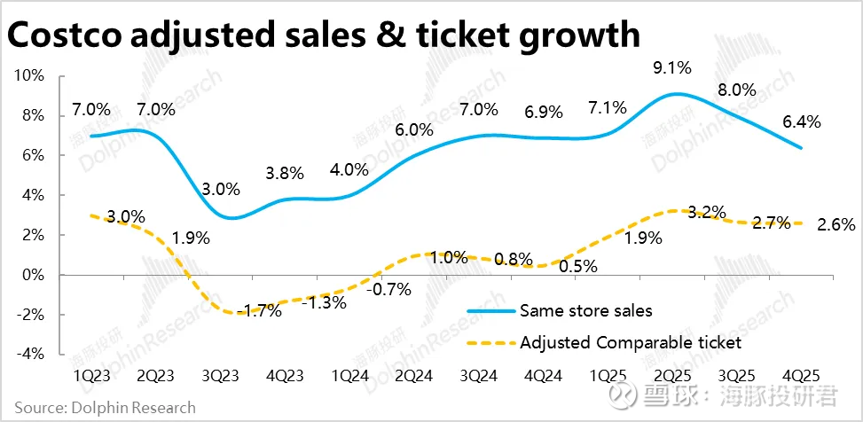 1、名义同店增长看似平稳,但客流已明显走弱:最关键的经营指标,Costco本季度整体同店销售增速为5.7%,相比上季持平,看起来依旧平稳。但同店客流量的增长已明显下滑到仅3.7%,是近3年来的最低水平。