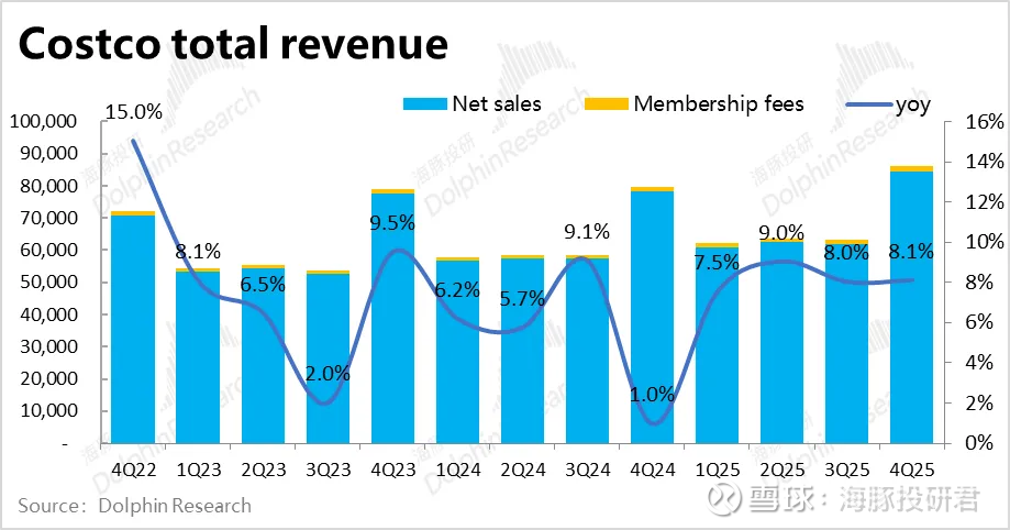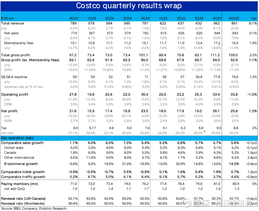 1、财务指标上,本季Costco实现总收入$862亿,同比增长8.1%,表现平稳且符合预期。