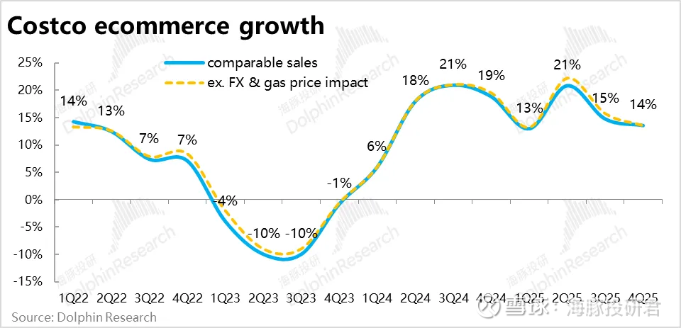 3、线上客流逆势增长:相比线下门店的客流疲软,Costco本季电商销售额同比增长13.6%,表现明显更平稳。原因是本季Costco线上站点流量同比增长27%,反比上季的20%有不小提速。