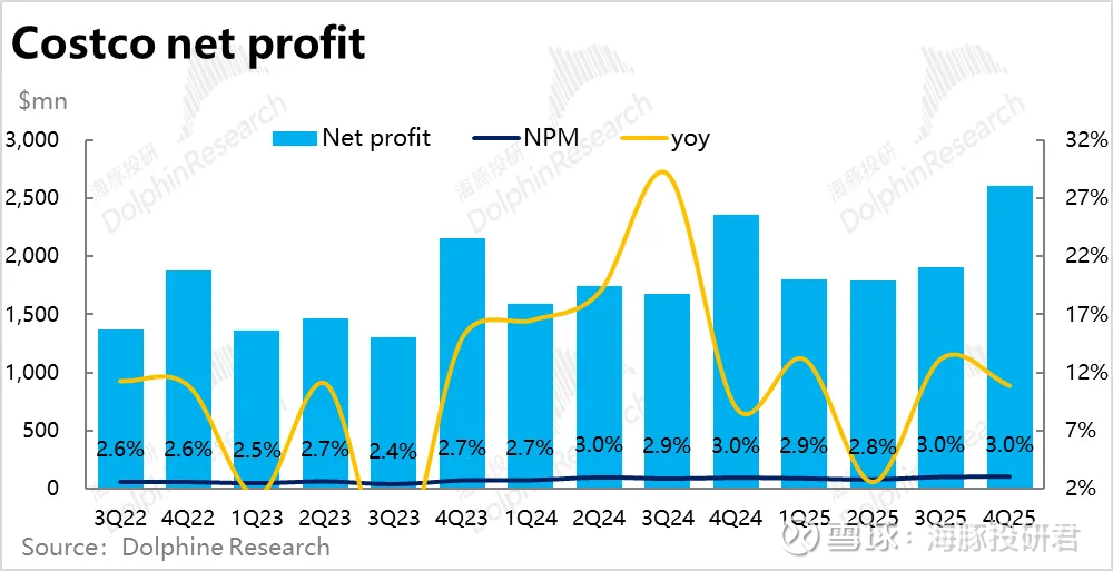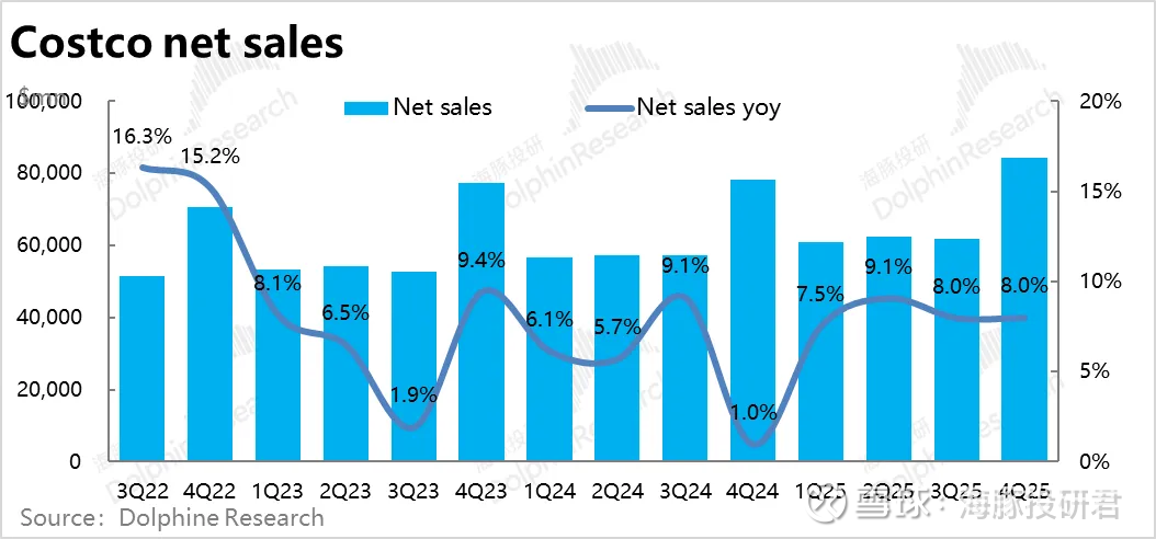 全球折扣零售王者—$好市多(COST)$ 于9月26日美股盘后,发布了截至8月底的2025财年4季度财报。大体上Costco的也就增长仍是比较平稳的,收入和经营利润双双维持8%~9%的增长,但也暴露出了一些潜在的问题,具体来看:
