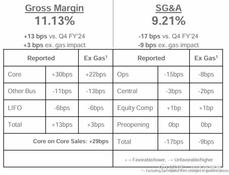 据公司披露,绝大部分的毛利走高(10bps)是来自油气价格的下降。除此之外,公司核心零售业务毛利的提高,被附加业务毛利的下滑和后进先出(LIFO)规则下成本的上升的影响抵消后,贡献了剩下3bps的零售毛利率上升。