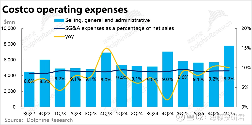 同时,从成本和费用角度,虽然在销售端Costco确实有能力将商品成本的走高,传递给供应链或者消费者承担,自身的毛利率持续在走高。
