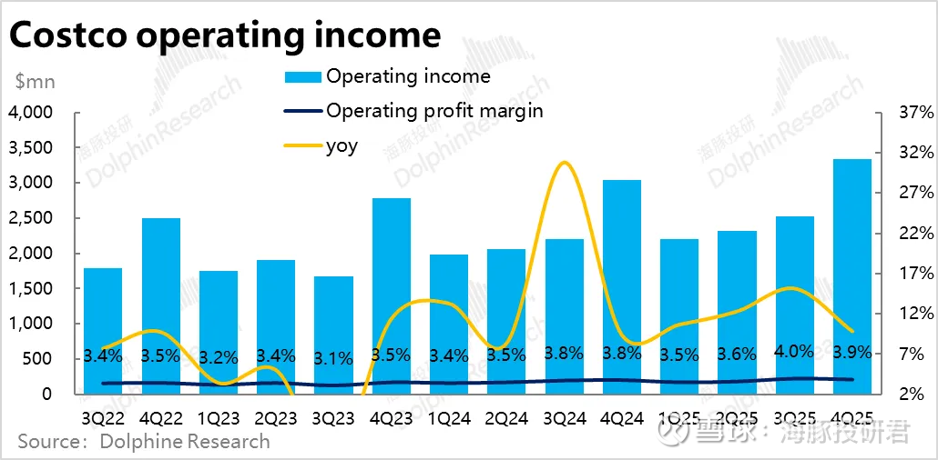 8、费用扩张拖累利润增长:由于费用率同比扩张的幅度高于销售毛利率扩张幅度,导致零售业务的利润率收窄(因会费收入的增长,公司整体的经营利润率还是走高的)。因此,本季公司的经营利润为33.4亿,小幅跑输预期的33.8亿。同比增速也跌至个位数的9.8%,继续向收入增速靠拢。利润表现无疑并不好。