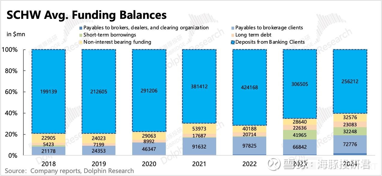而在开设自家银行的同时,嘉信继续保持与 TD 等外部银行的合作。在后面的降息周期,投资债券以获得固定利息收益的性价比降低,嘉信可以在保留一定规模资金用于客户保证金交易的融资需求外,将客户账户中多余的闲置资金存入 TD 银行并收取一定的费用,这样等于将负债移到表外,保证 ROE 的稳定。