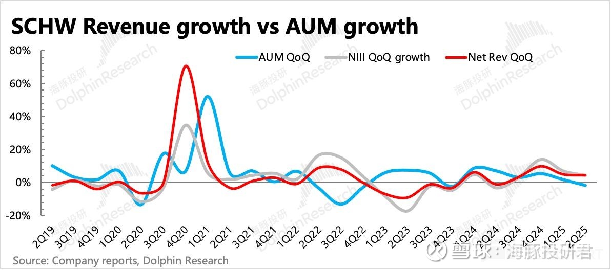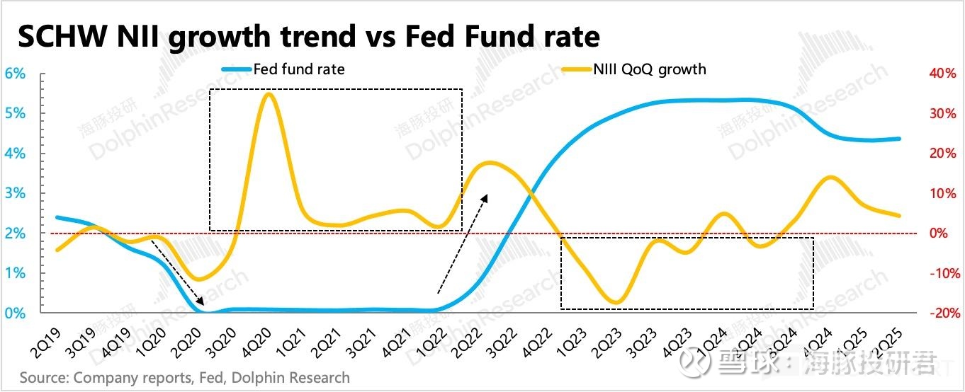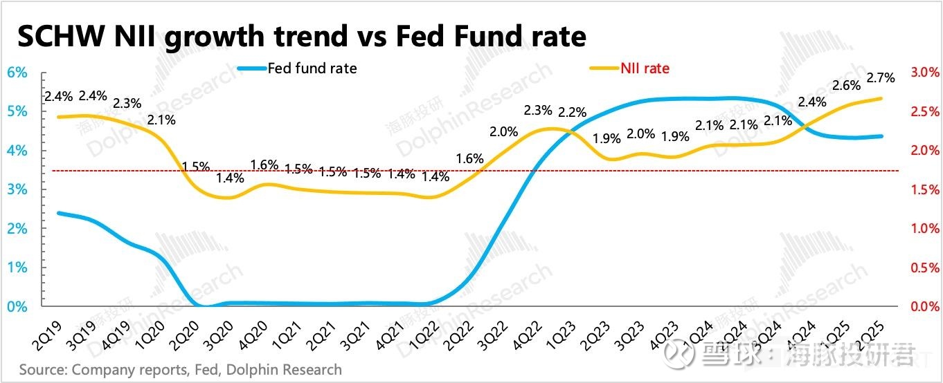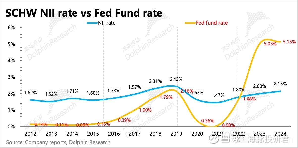 总的来说,一般情况下,加息环境仍然更有利于嘉信的息差净收入,降息环境稍显不利。但若利息变动后期,对利息收入的影响会反向,即高息环境久了会压制净利息收入,低息环境久了会对净利息收入产生正向拉动。