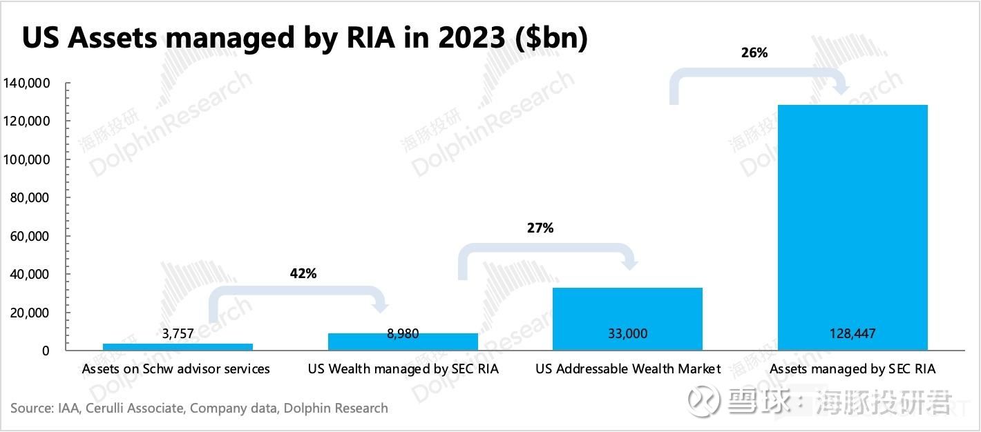在收购 Ameritrade 后,嘉信已经超越 Fidelity 成为 RIA 托管龙头。从规模上看,嘉信平台上的 RIA 托管资产,在 2023 年的市占率就已经超过 40%。而从目前全行业 1.6 万个注册 RIA 机构中,其中 90% 都在嘉信上开设了托管账户,变相的为嘉信做了品牌宣传。