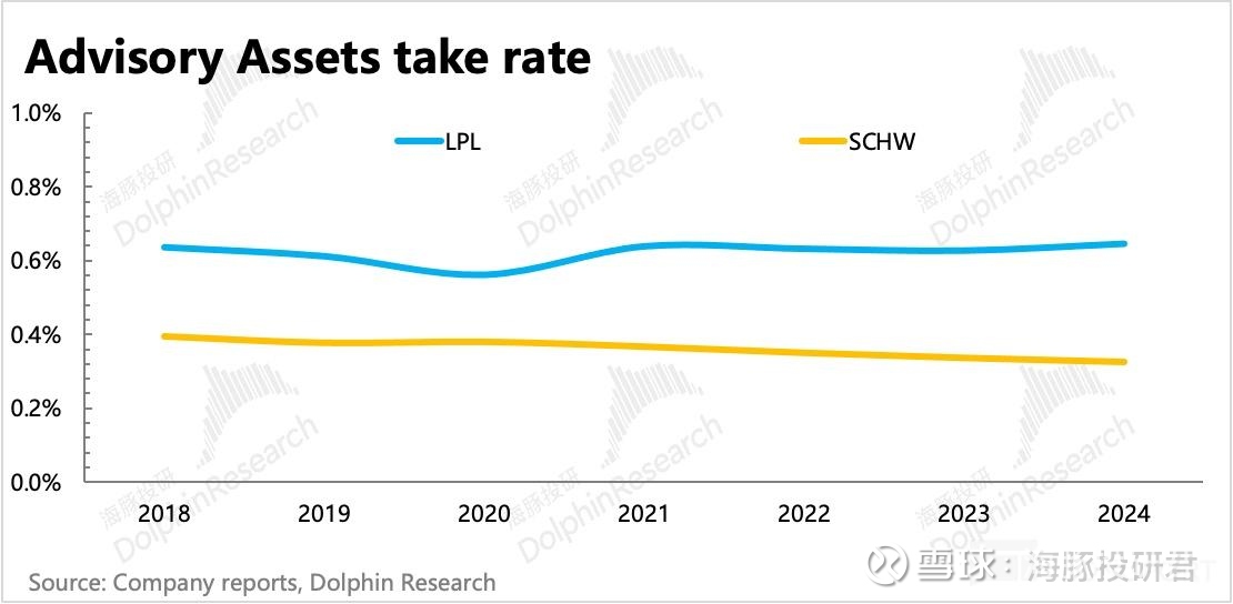 截至 2024 年,LPL 拥有近 2.9 万名个人投顾,服务资产规模 9570 亿;而嘉信拥有 1000 多名自有投顾,和 9000 多个外部 RIA 机构(大多为低于 5 名投顾的小机构),合计服务客户资产规模 5.6 万亿。简单直观比较,LPL 投顾单人平均管理资产的规模量级(约 3000 美元)要明显低于嘉信(1P+3P 合计来看,约 12000 美元)。