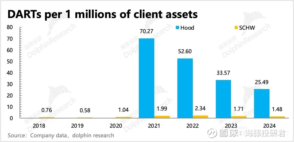 不过因为核心用户群体的风险偏好差异,整合后的嘉信用户交易频次(每一百万美元的客户资产日均交易次数),仍然不能和 Robinhood 相比,但嘉信也并非没有缩小差距的可能。(嘉信用户资产配置中基金 + 固收占比接近六成,只有 40% 为与交易相关的权益资产。而 Robinhood 用户将 90% 的资金都配置了高风险资产,其中 70% 为股票、20% 为加密货币。)