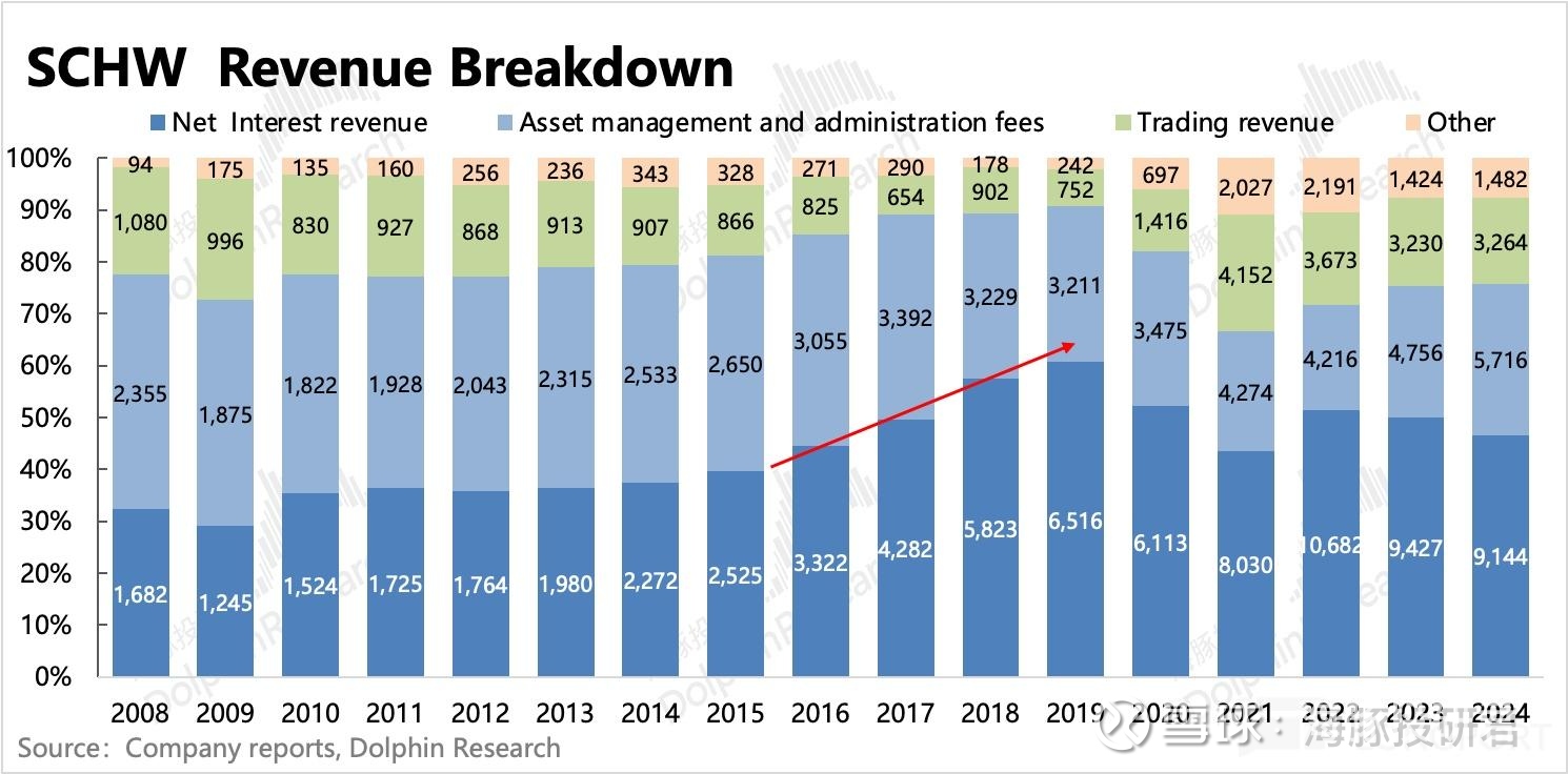 同时,转型的痕迹也体现到了实际业绩中,分别对应着收入增长主力,从零售交易(佣金、订单流收入)切换到财富管理(基金管理费、咨询费、RIA 托管收入)。再然后,随着 2016 年加息周期开启,息差创收(存、贷款利息/投资收益)很快超越财富管理,正式接过第一增长大旗。