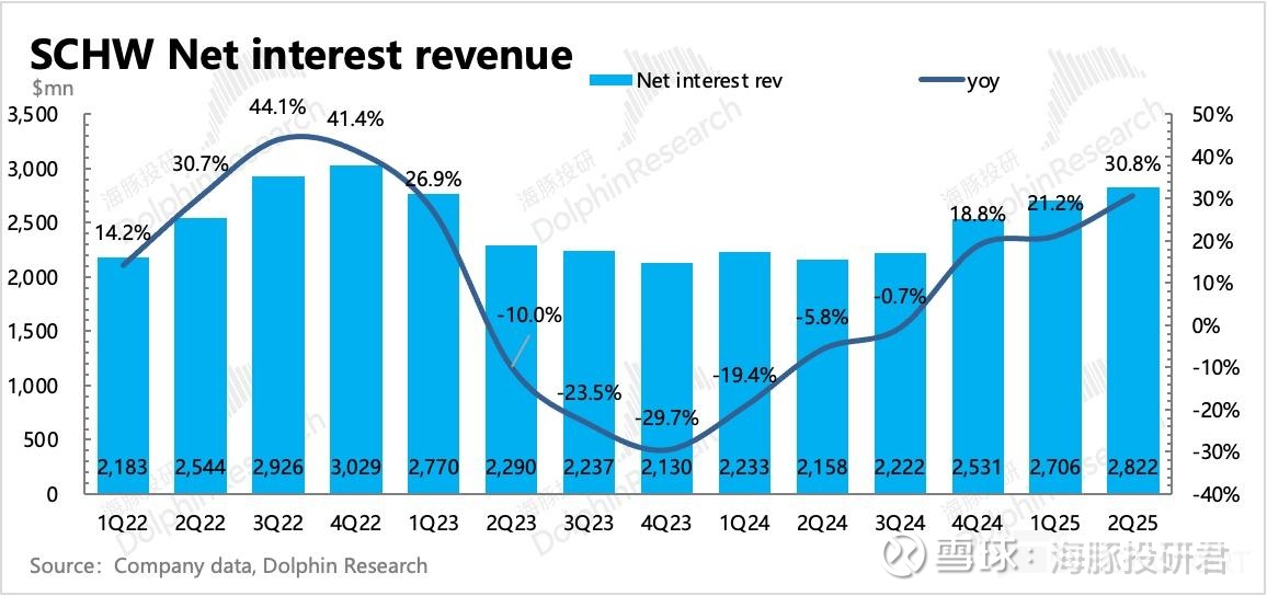 但聚沙成塔,在乘以千万账户的 “规模倍数” 后,对于嘉信来说则是一笔金额庞大的集体存款。以 2024 年为例,客户资产中现金存款总规模有 4500 亿,息差每扩大 100 个基点,对嘉信而言就是 45 亿的纯利净增。