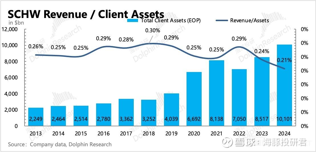 不过,低价/免费似乎也限制了资产直接变现的效率。从收入/客户资产规模来看,嘉信显著低于同行,无论是全能型的老派投行,还是相对年轻的互联网券商新贵。