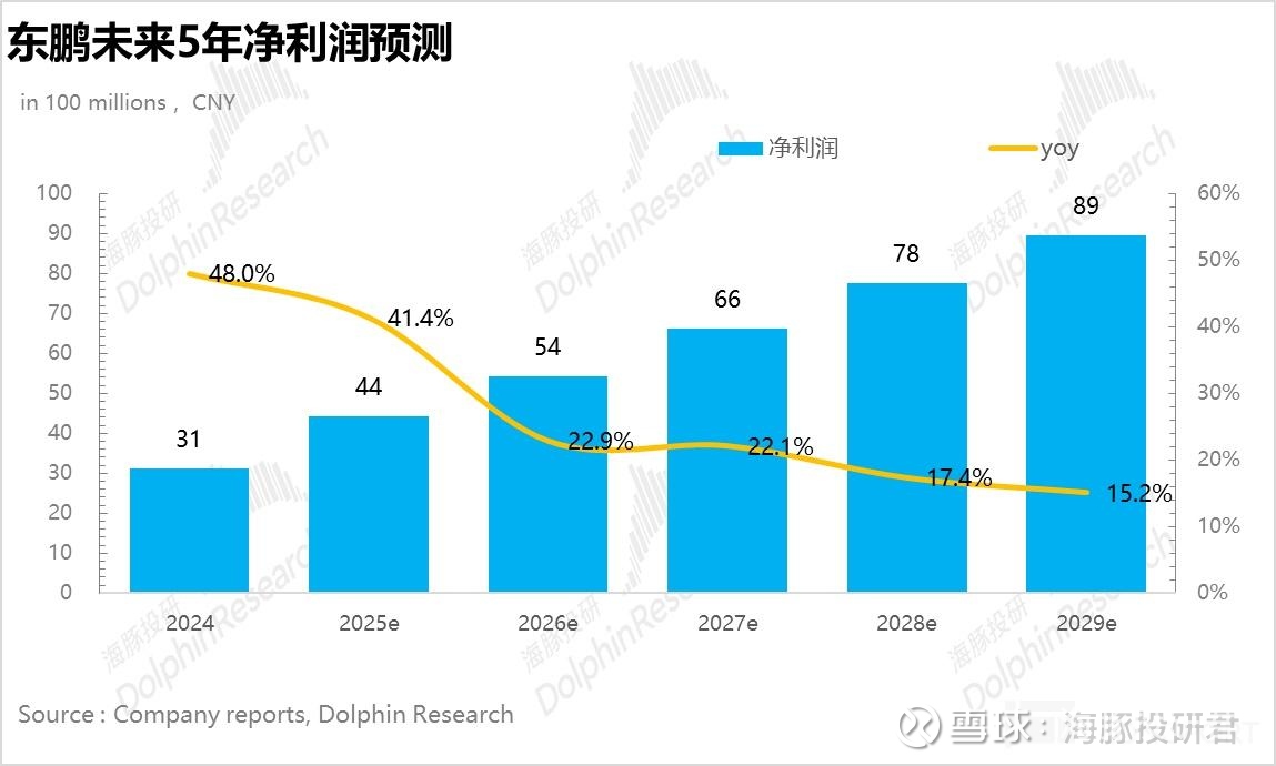 经营费用上,伴随经营杠杆的释放,海豚君假设东鹏的经营费用率逐步走低,最终,净利润从 31 亿元增长至 89 亿元,对应 CAGR 为 23%。