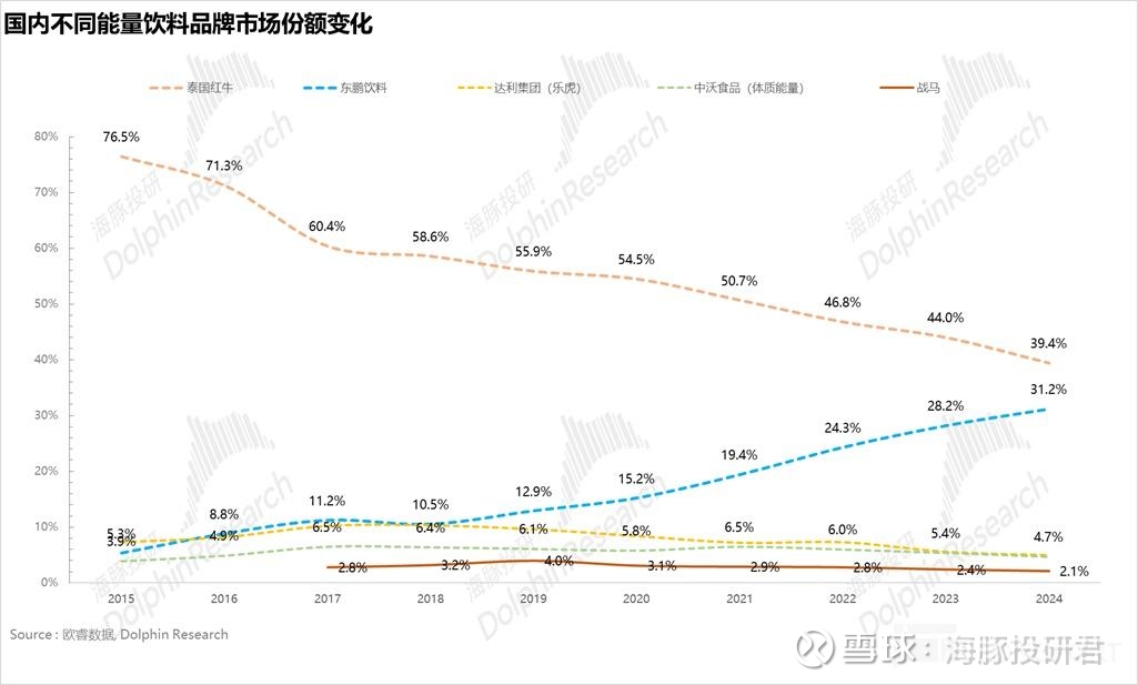实际上,纵观所有软饮料的单一品类,从零售口径来看,能够突破 200 亿俱乐部的本来就少之又少,要么是刚性高频的必需品(比如农夫山泉的包装水),要么是有核心功能且已经完成市场教育的超级品牌(红牛、可乐),而一个共性规律在于这些品类在突破 200 亿之后基本也都面临了渗透率达到瓶颈、替代品涌入所带来的增速放缓问题,海豚君认为对于东鹏特饮来说其实也不例外。