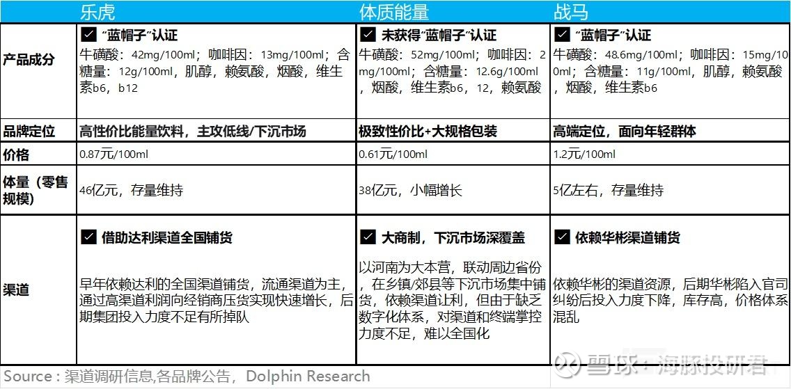 讨论完东鹏最强劲的竞争对手红牛,我们再来看下其他追赶者是否可能会对东鹏的市场份额造成冲击:就追赶者而言,三个核心玩家分别是达利集团的乐虎、中沃食品的体质能量以及华彬旗下的战马。