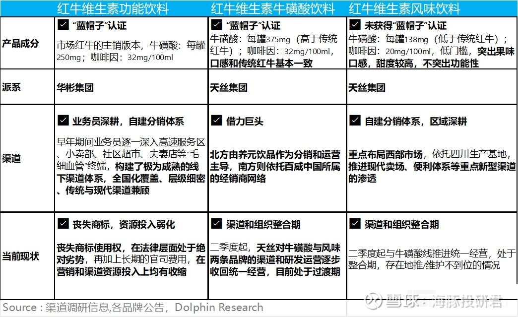 也就是说,当前市面上一共分为 3 种红牛,隶属于华彬、天丝两大阵营。为了深入分析红牛系对东鹏的影响,我们先简单介绍下 3 种红牛的来头: