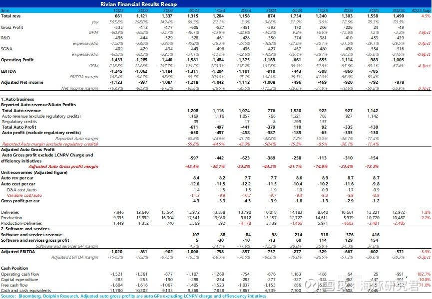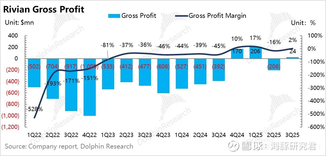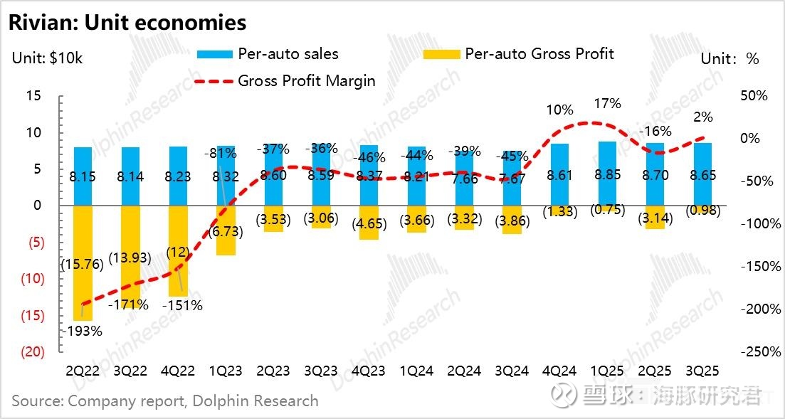 ① 汽车毛利率环比大幅上行:本季度报表端的汽车毛利率从上季度-36% 环比上行了 25 个百分点至本季度-11.4%,环比上行幅度很大。而与二季度一样,三季度 Rivian 同样受到无碳积分收入确认(纯毛利业务),以及关税对采购成本冲击的负面影响,但卖车毛利率仍然有了超预期的环比大幅提升表现。