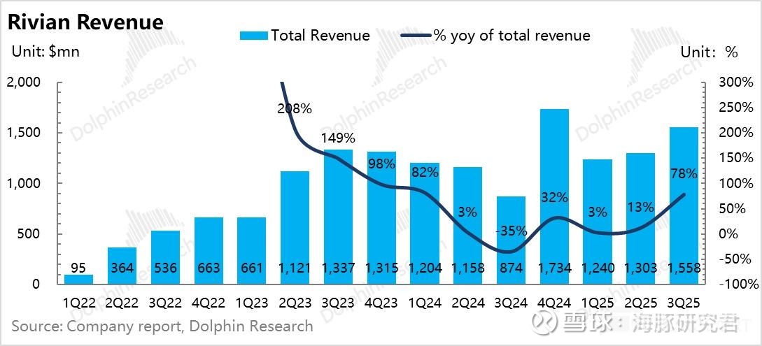 回想一下 Rivian 上季度深亏的业绩主要受到了特朗普上台后对于新能源汽车支持力度退坡 + 关税战负面影响,虽然本季度 Rivian 同样也受到碳积分补贴退坡 + 关税的负面影响,但由于 Rivian 本季度受益于 IRA 补贴退坡前的抢购效应,卖车销量端在环比回升,以及在三季度抢装效应下需求端比较有韧性,不需要采取折扣,所以最后卖车收入端也有不错的表现。