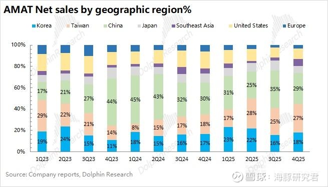 2)韩国和中国台湾收入增长,中国大陆和美国收入下滑:其中中国台湾地区同比贡献了最大的增量,主要得益于台积电大幅增长的资本开支;韩国地区的增长,来自于海力士的投入加大,抵消了三星在今年资本开支方面的削减;
