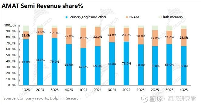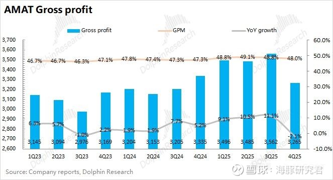 4、下季度指引:应用材料 AMAT 预期 2026 财年第一季度营收 63.5-73.5 亿美元,市场预期(68 亿美元)。区间中值环比微增 1%;公司预期下季度的 Non-GAAP 每股利润为 1.98-2.38 美元,市场预期(2.15 美元)。受贸易限制等因素影响,公司对下季度预期相对谨慎,增长主要来自于 2026 年下半年。