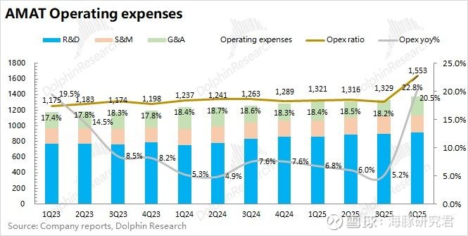 应用材料本季度毛利率 48%,同比提升 0.7pct,接近于市场预期(48.1%)。毛利率的同比提升,主要是由于公司先进设备出货占比提升以及产品价格提高带动。