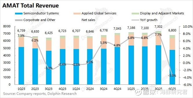 1、核心数据:应用材料 AMAT 本季度收入 68 亿美元,同比下滑 3.5%,略好于市场预期(66.8 亿美元)。其中主要是受半导体设备业务下滑的影响,尤其是逻辑类相关需求在中国等地区受限比例提升。