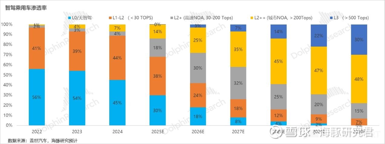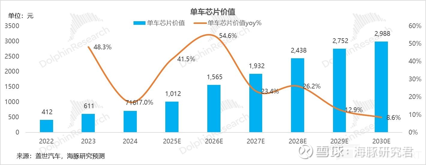 海豚君预计单车芯片价值将在 2030 年增长至近 3000 元,主要由大算力芯片占比的提升所带动(200 TOPS 以上芯片占比达到 78%)。