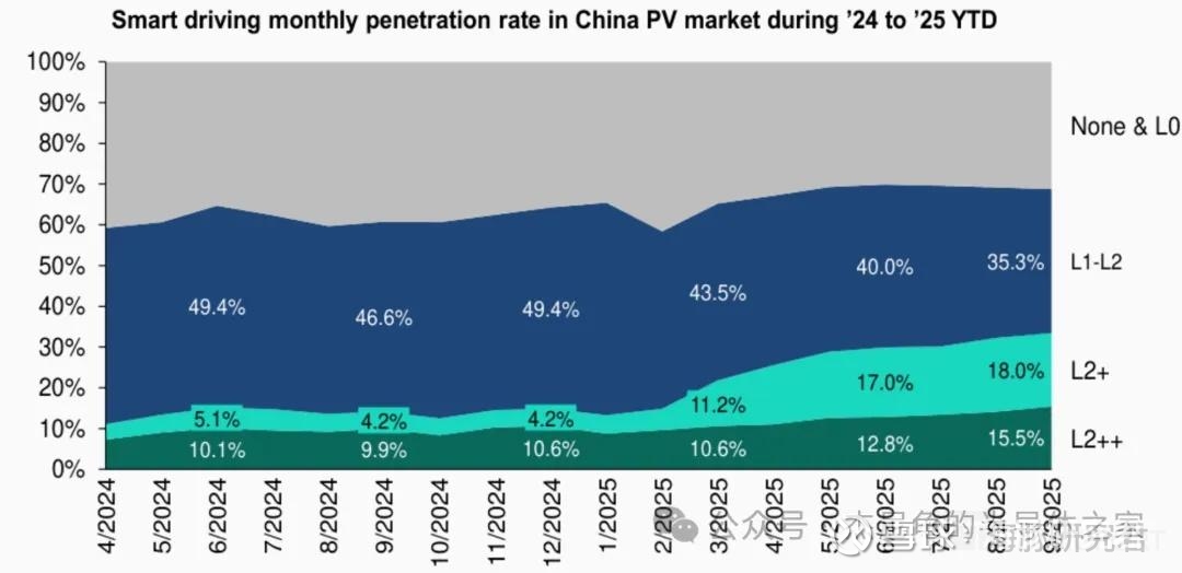 但 2025 年,在以比亚迪为首的 “智驾平权” 将高速 NOA 下沉到 10-20 万元级别的平价车型中;以华为和新势力为首的 “智驾引领” 梯队则加速普及高阶的城市 NOA,L2+ 及以上 9 月达到了 33.5%,智驾渗透率正在加速提升。