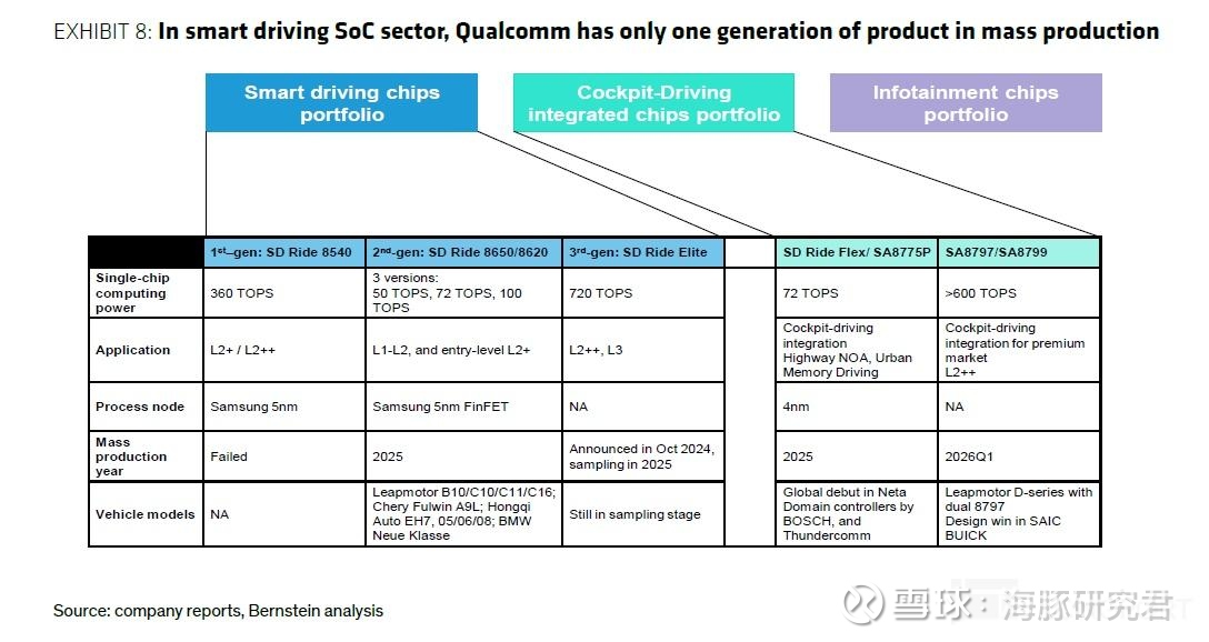 高通下一代智驾芯片侧重 “舱驾一体”,把驾驶和座舱集成到一颗 SoC 中(如规划中的 SA8797/SA8799 等),将于 2026 年一季度量产。目前的定点车型为零跑 D 系列(搭载双 8797 芯片),未来大芯片市场可能有机会。
