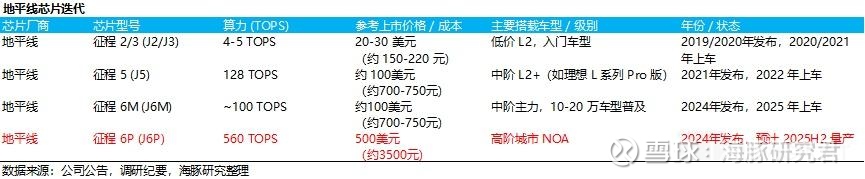 从地平线芯片的迭代来看,地平线用于城市 NOA 智驾的 J6P 芯片约 500 美元,是用于高速 NOA 智驾 J5 和 J6M 售价的 5 倍,更远高于地平线初代用于 L1-L2 低级智驾的 J2/J3 芯片售价。