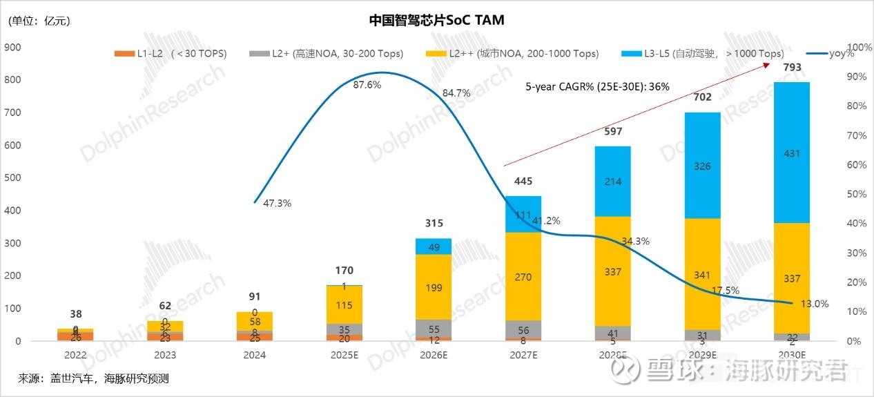正是因为智驾芯片的 “量价齐升” 逻辑,海豚君测算 2025-2030 年市场规模 CAGR 将达到 36%,至 793 亿元。其中单车芯片价值 5 年 CAGR 为 24%, 智驾车型销量 5 年 CAGR 为 10%。