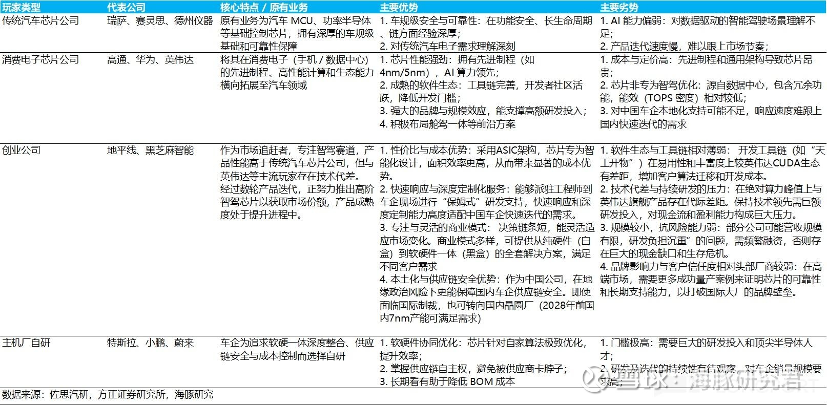 ④ 主机厂自研:特斯拉、小鹏汽车、蔚来汽车等。主机厂追求软硬一体化深度整合,掌握供应链自主权以及降低 BOM 成本,同时可将智驾芯片扩展至具身智能上。但自研芯片门槛高,对车企的销量规模,人才储备和资金投入要求都很苛刻,不是谁都能做。