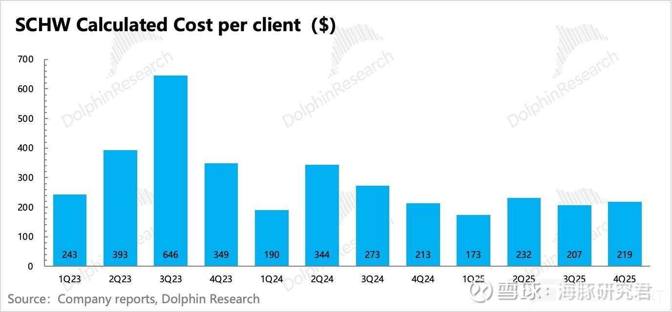 保持这样的增长,嘉信的营销费用也相对稳定。四季度综合计算下人均获客成本 219 美元,过去两年基本围绕在 200-300 美元/人的中枢水平波动,反映存量用户的粘性和嘉信在市场上的高品牌认知度。