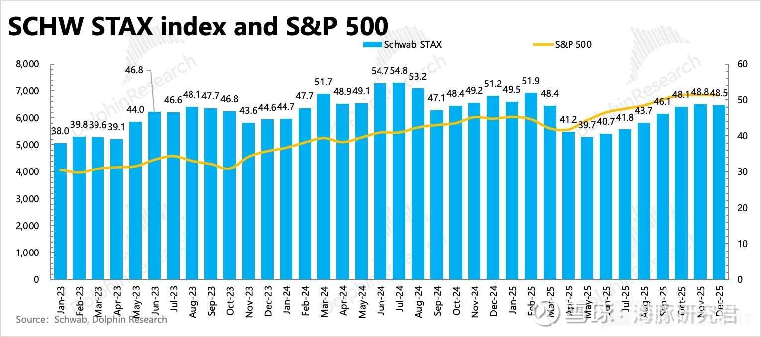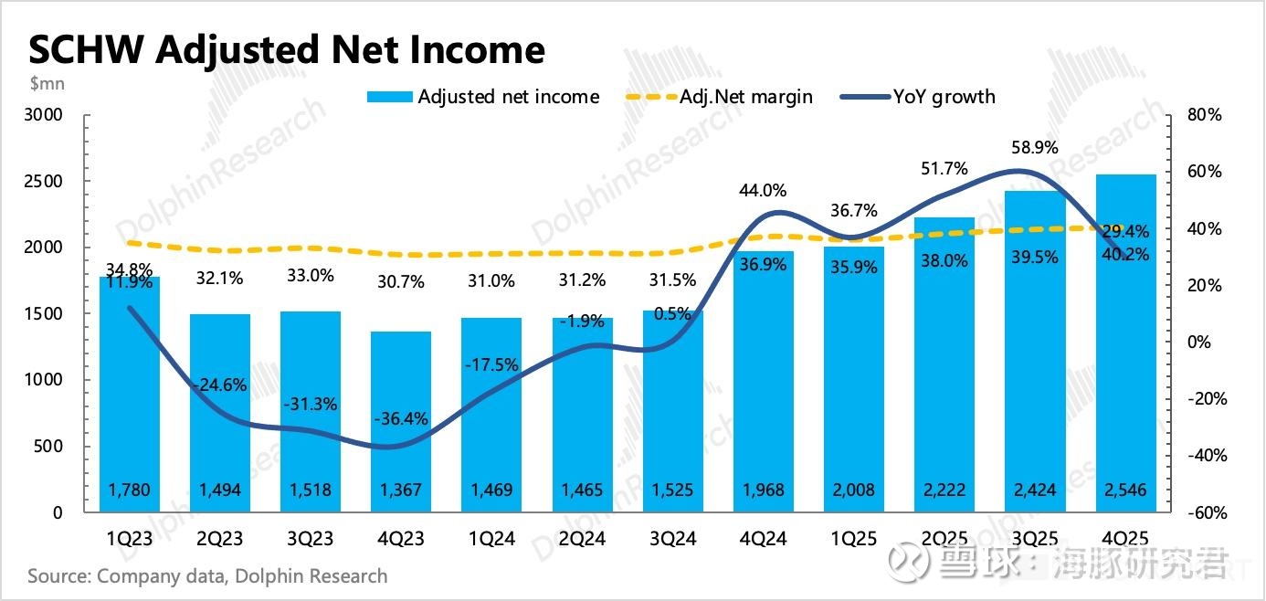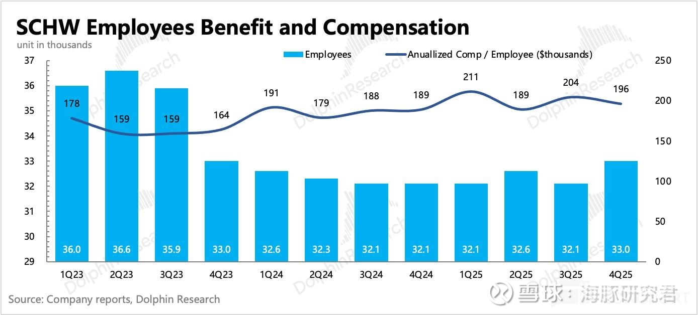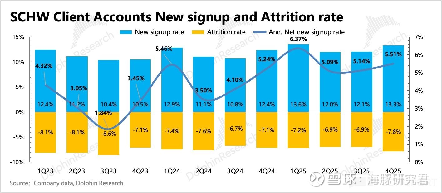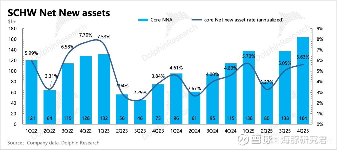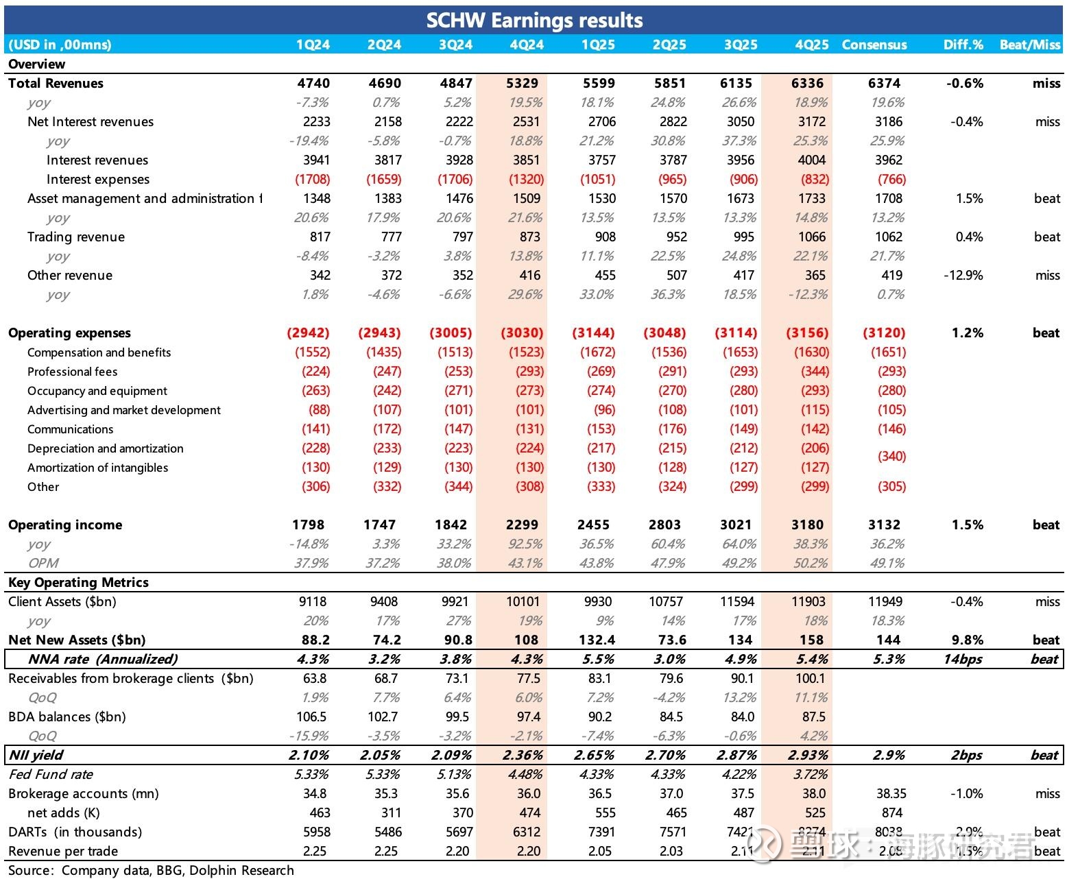 $嘉信理财(SCHW)$ 四季度业绩画风依旧很稳,整体财务表现符合预期,收入稍 miss(预期差主要在 BDA 账户收费上),但因为费用控制得比较好,利润 beat 了回来。值得一提的是,海豚君主要关注的核心运营指标则表现不错,均超市场预期,反映嘉信稳定的内生增长动能。