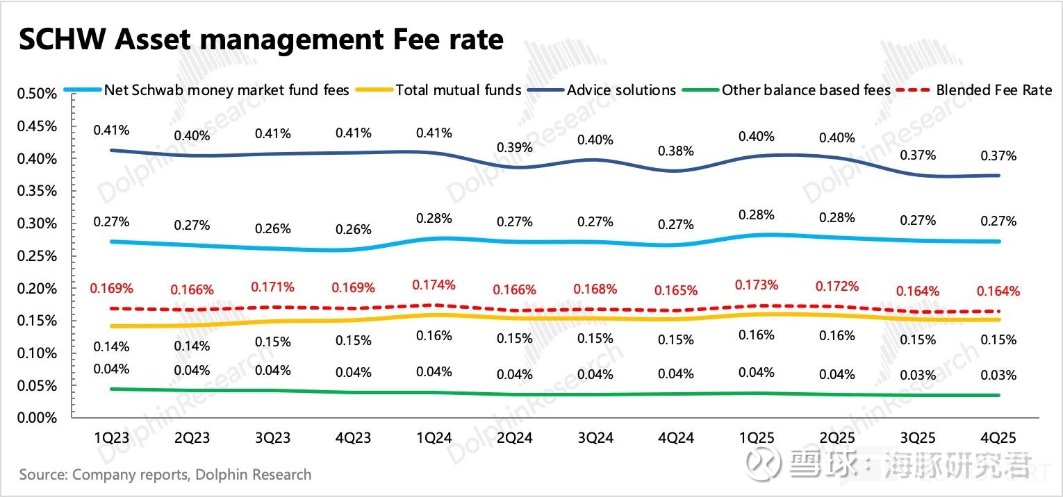 4、财富管理业务:在基数走高下收入反而增长加速达到 15%,但费率依旧稳定小幅下滑,因此主要靠嘉信整个平台生态的资产规模拉动。