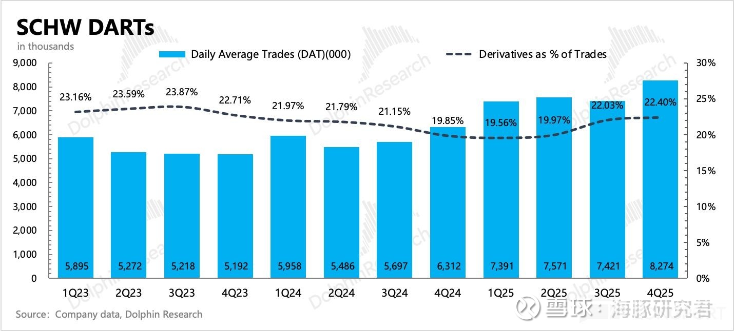 因此,嘉信交易收入四季度同比增长 22%,高基数下较三季度的 25% 有所放缓。其中日均交易笔数 827 万,同比增长 31%,衍生品交易笔数占比继续提升。