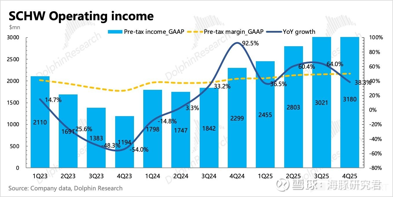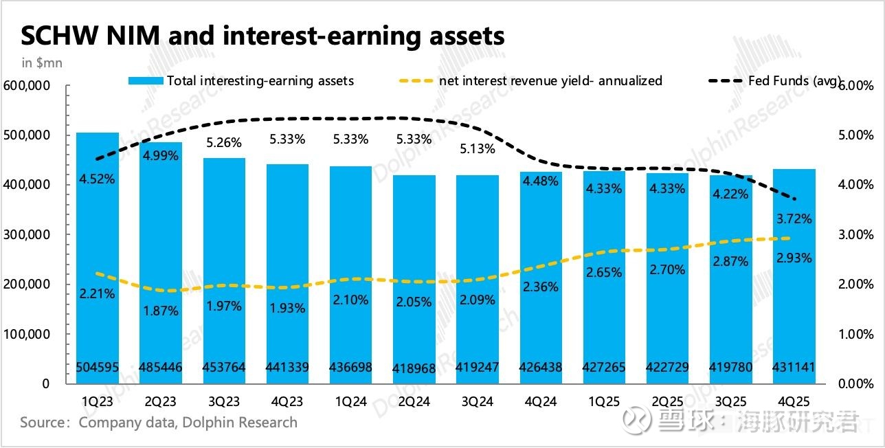 四季度整体业绩还是以稳为主,但由于资产净增加速度、净息差率两个核心指标表现不错,海豚君对嘉信的财报反馈稍偏积极。
