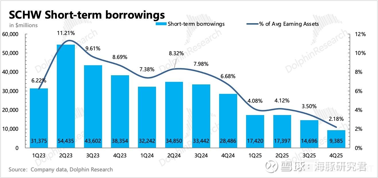 背后原因和 Q3 类似,也是利息收入扩张、成本降低的双向推动——收入扩张来自融资交易的活跃,规模增长但利率下滑不多。成本下降源于两方面,一方面短债规模下降(环比 Q3 净减少 50 亿,相比上季度的 21 亿翻倍下降,反映公司加速偿还前两年危机时刻借入的高息短债),另一方面灵活储蓄利率也随降息预期环比大幅下滑,从 0.43% 下降到 0.29%。